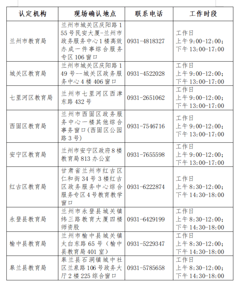 2.申报高级中学、中等职业学校(含中等职业学校实习指导)教师资格认定机构为兰州市教育局。现场确认具体地址为兰州市城关区庆阳路155号民安大厦-兰州市政务服务中心1楼高效办成一件事综合服务专区106窗口。