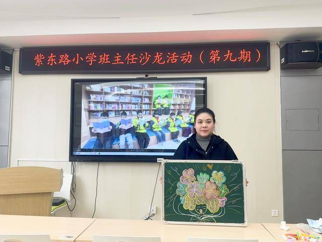 在才艺展示环节,宋璀煜老师带来的粉笔画——“繁花中的孩子”,新颖别致。这幅粉笔画恰似班级群像——画面中被缤纷花朵环绕的形象,象征着班级里每一位充满朝气的同学,大家各具色彩、各有风采,如同花朵般在集体中绽放独特光芒。宋老师谈到,在班级管理中,正以这样“尊重个性、凝聚合力”的理念,让每一位同学都能在集体这片沃土上,像画中花朵一样尽情舒展、快乐成长。最后,德育主任冯丹进行总结,她高度赞扬了两位老师的用心准备和精彩分享,同时强调班主任要在“德育创新”与“管理智慧”的双重提升中,成为学生品德养成的“塑造者”与“引领者”。