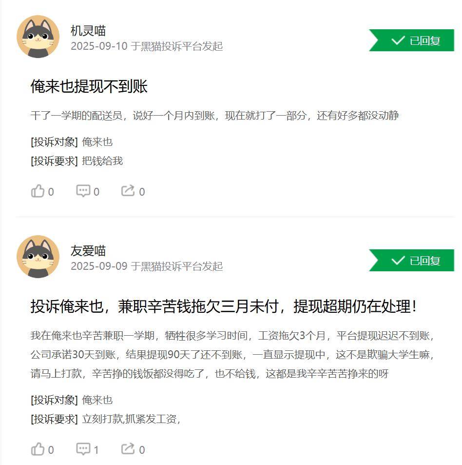比如覆盖了300多所大学的App俺来也,通过和高校达成3-5年独家协议成为了不少学校的“唯一指定外卖平台”。和美团等用专业骑手送餐不同,俺来也主要招募校内学生兼职来跑腿送外卖,学生既是用户也是骑手。但去年,多名在校学生在黑猫投诉平台发声,称“平台已拖欠超2个月薪资”。