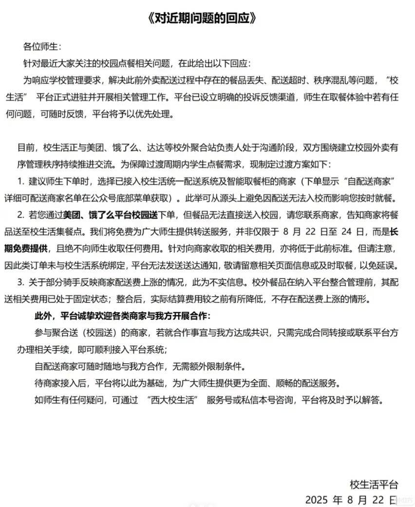 校方回应,引入“校生活”,是为了解决学校师生强烈反应的校园外卖乱放、错拿、丢失等问题。早在去年,就有西南大学的学生在社交媒体上抱怨“外卖进校40分钟了还没送到手上”。