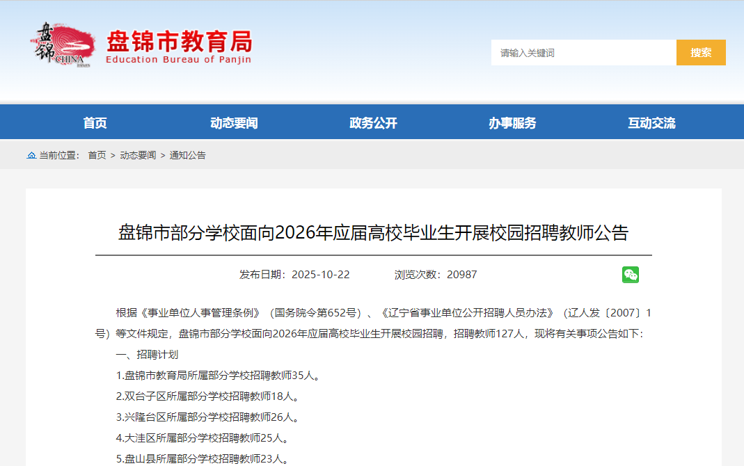 根据《事业单位人事管理条例》(国务院令第652号)、《辽宁省事业单位公开招聘人员办法》(辽人发〔2007〕1号)等文件规定,盘锦市部分学校面向2026年应届高校毕业生开展校园招聘,招聘教师127人,现将有关事项公告如下: