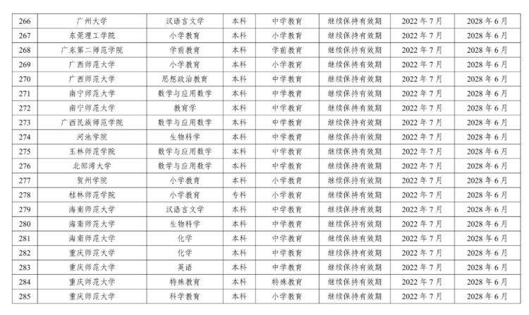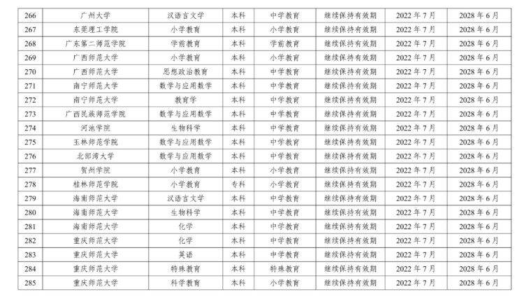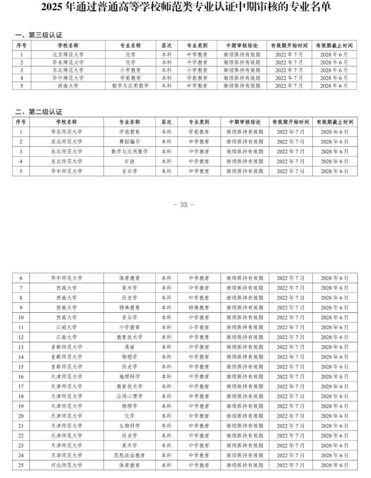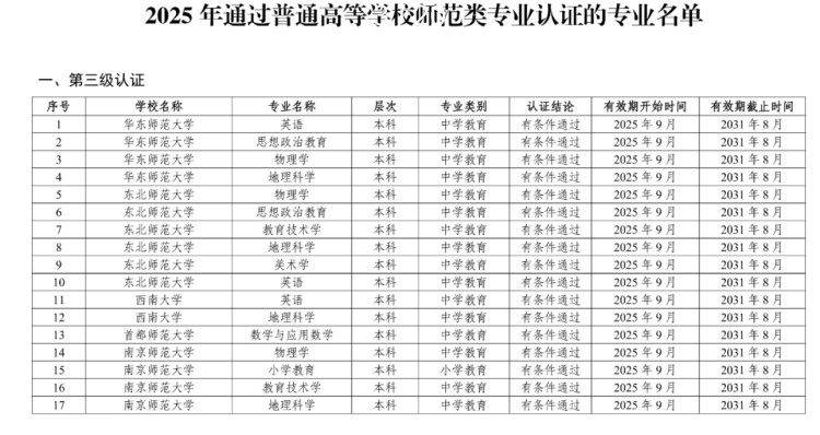 经高校申请、教育评估机构组织专家考查、普通高等学校师范类专业认证专家委员会审定,华东师范大学英语专业等17个专业通过第三级专业认证,中华女子学院学前教育专业等576个专业通过第二级专业认证,认证结论有效期六年,自2025年9月起至2031年8月止。经高校提交整改材料、专家审查、普通高等学校师范类专业认证专家委员会审定,北京师范大学化学专业等386个专业通过了师范类专业认证中期审核,继续保持原认证有效期。