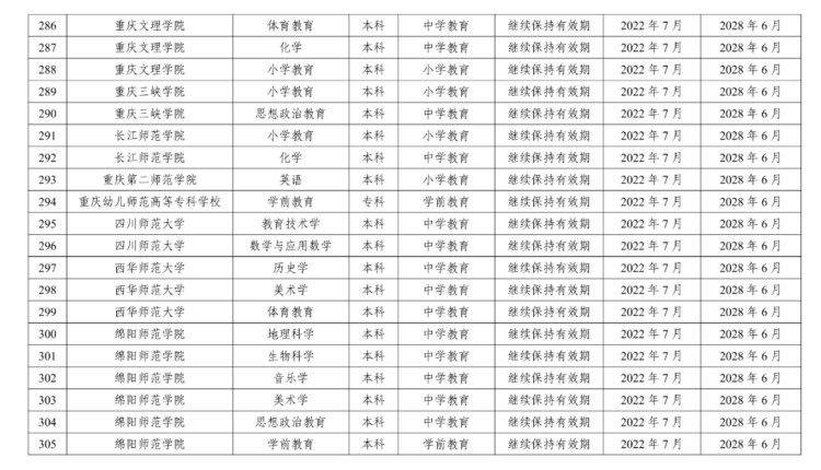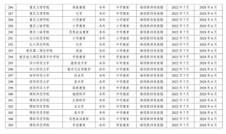根据公布的名单,西南大学的英语、地理科学2个专业通过第三级专业认证,重庆师范大学的舞蹈学、重庆人文科技学院的思想政治教育、汉语言文学、英语、数学与应用数学、美术学、重庆青年职业技术学院的学前教育、重庆文化艺术职业学院的学前教育等8个专业通过第二级专业认证。