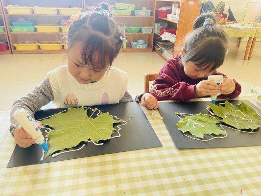 此外,教师带领孩子们开展了“手势舞”“盐画落叶”与“寻找秋天的”等活动。伴随着轻快的童谣,孩子们跟着老师伸出小手一起跳舞,稚嫩的动作与清脆的歌声交织,教室里满是童真活力。户外探索时,孩子们化身“小小自然侦探”,在幼儿园的草坪、树丛中寻找形态各异的树叶。回到教室后,孩子们用胶水勾勒树叶轮廓,再撒上洁白的盐粒,仿佛给树叶披上了一层“霜降”,原本普通的落叶在创意加持下,变成了独具特色的节气手工作品,孩子们举着自己的作品,脸上满是成就感。