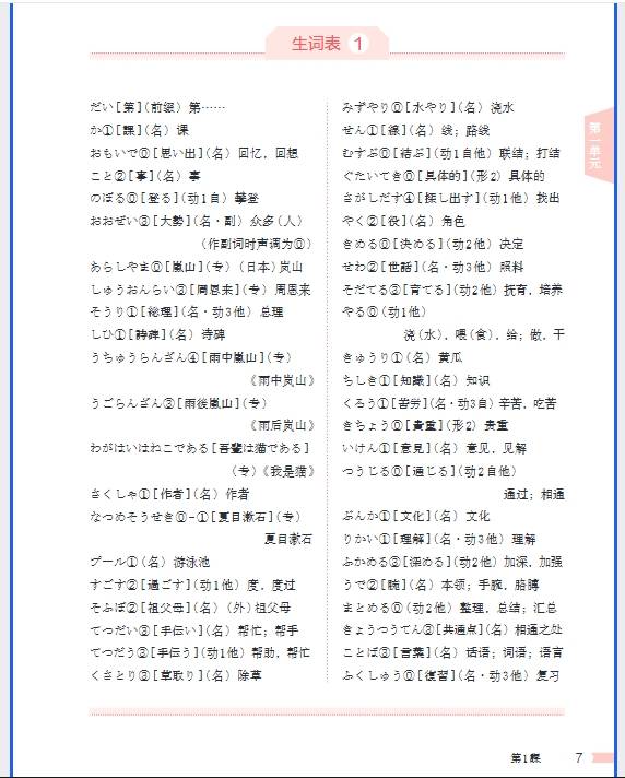 - 单元重点词汇:例如第一单元的 “見学”(けんがく)、“工場”(こうじょう)等;第二单元的 “べんとう”、“公園”(こうえん)等;第三单元的 “やる”、“なる”、“まだ” 等。