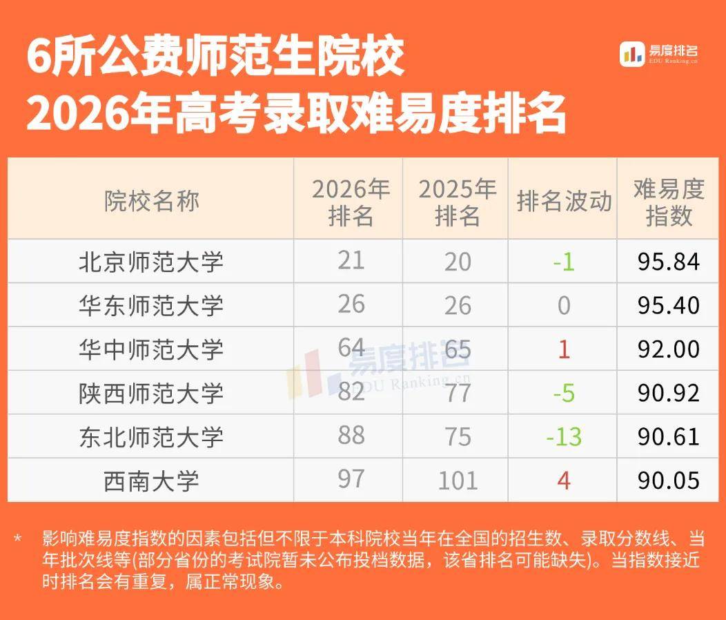 公费师范生适合那些热爱教育事业、并愿意回生源所在省从事中小学教育工作至少六年的考生。报考前务必了解清楚履约责任。在分数足够的前提下,可根据对城市、专业和未来就业省份的偏好,在六所院校中做出选择,2026高考录取难易度排名如下: