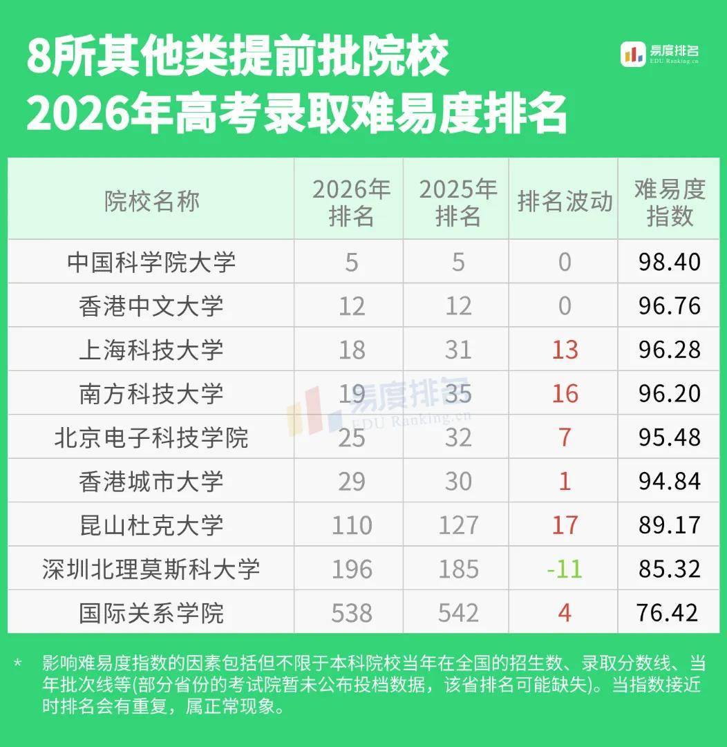 中国科学院大学与香港中文大学排名稳居前列,与清北华五媲美,是科研苗子的圣地。上海科技大学和南方科技大学排名分别上升13和16位,这两所“小而精”的研究型大学,凭借其创新的培养模式和极高的升学就业质量,已成为高分考生的新宠。北京电子科技学院(上升7位)为党政机关培养机要人才,其特殊的就业去向使其始终保持高热度。
