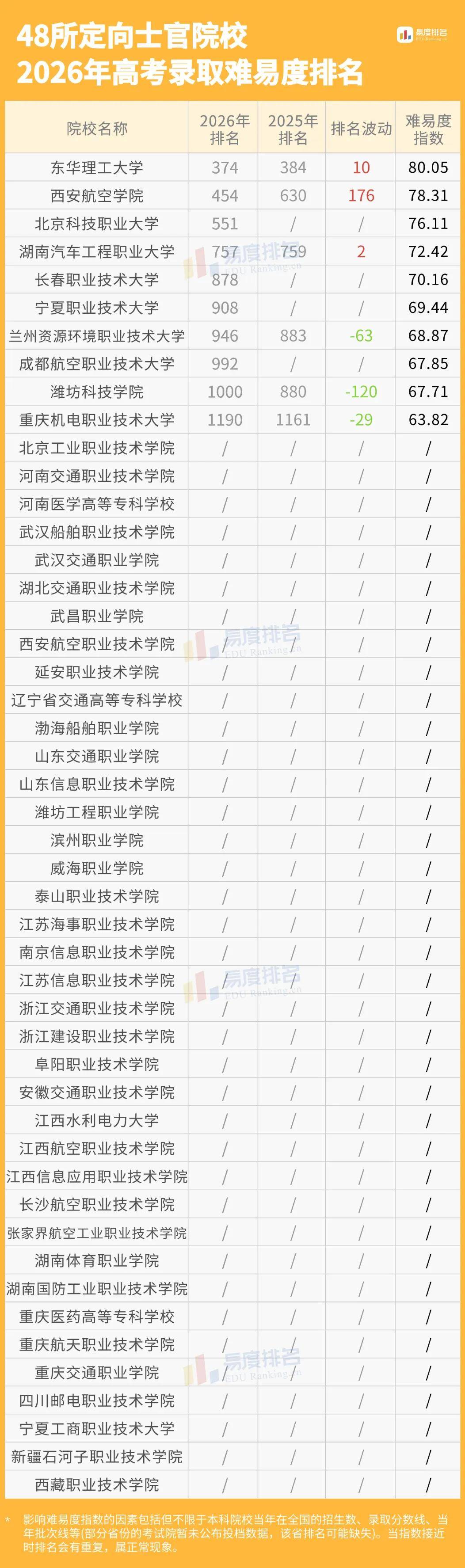 西安航空学院排名飙升176位,东华理工大学也上升10位。这表明,拥有优势专业(如航空、核电)且办学层次较高的本科院校,在定向士官项目中正受到越来越多考生的青睐。