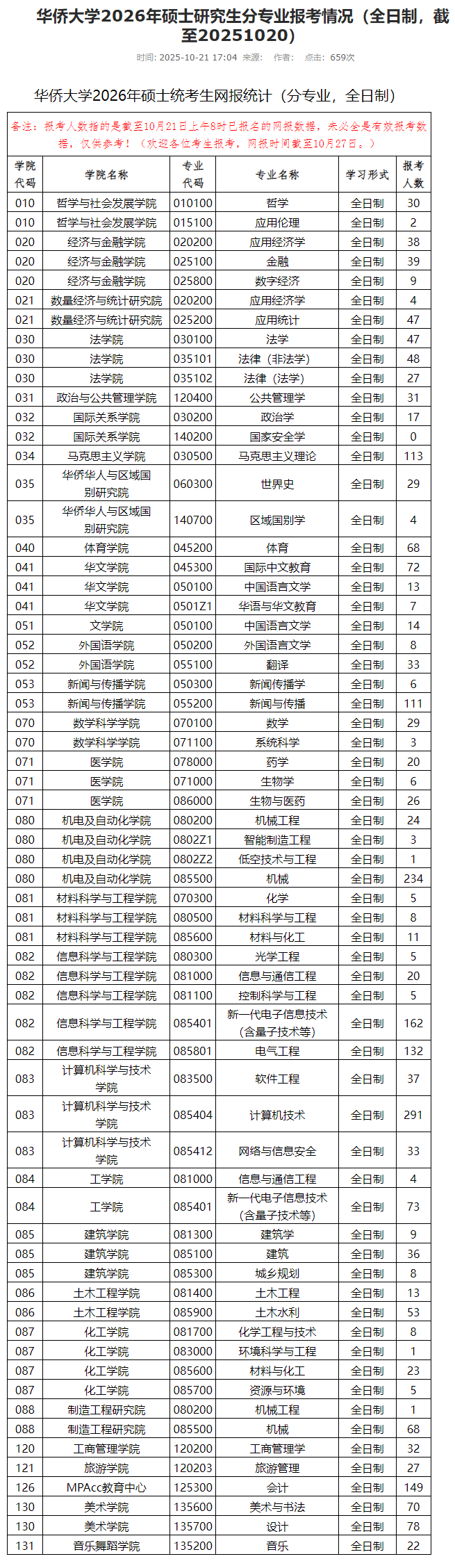 根据最新的网报数据(截至10月21日),华侨大学26年全日制报考人数为2552人。对比上年(2025年考研)同期,华侨大学公布的全日制报考人数为3483人,今年人数有所减少。