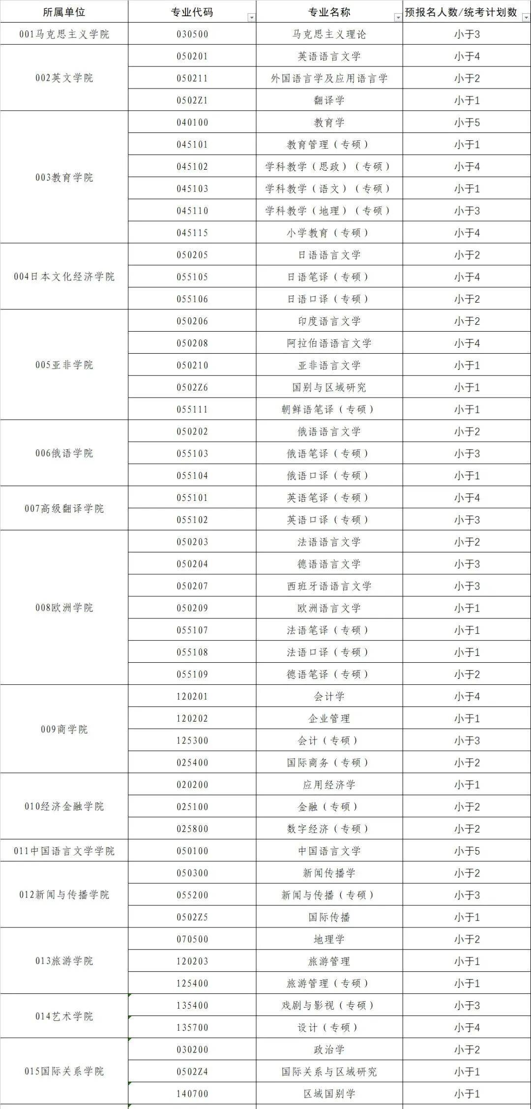西安外国语大学发布了26考研预报名情况,具体为报名人数/计划人数小于5的专业。