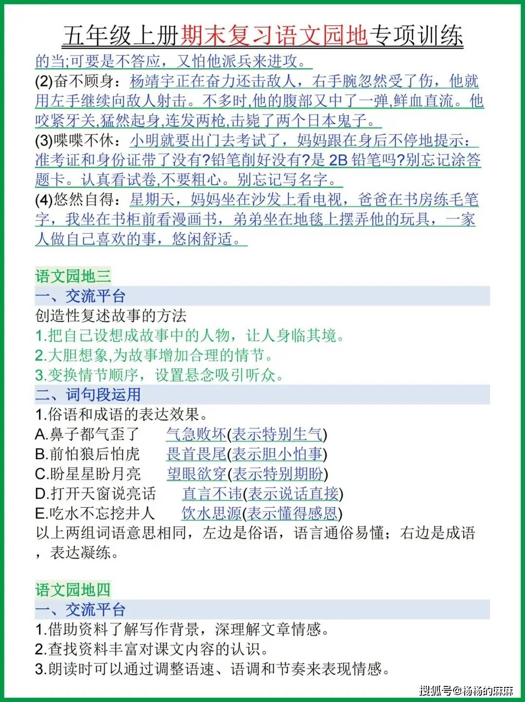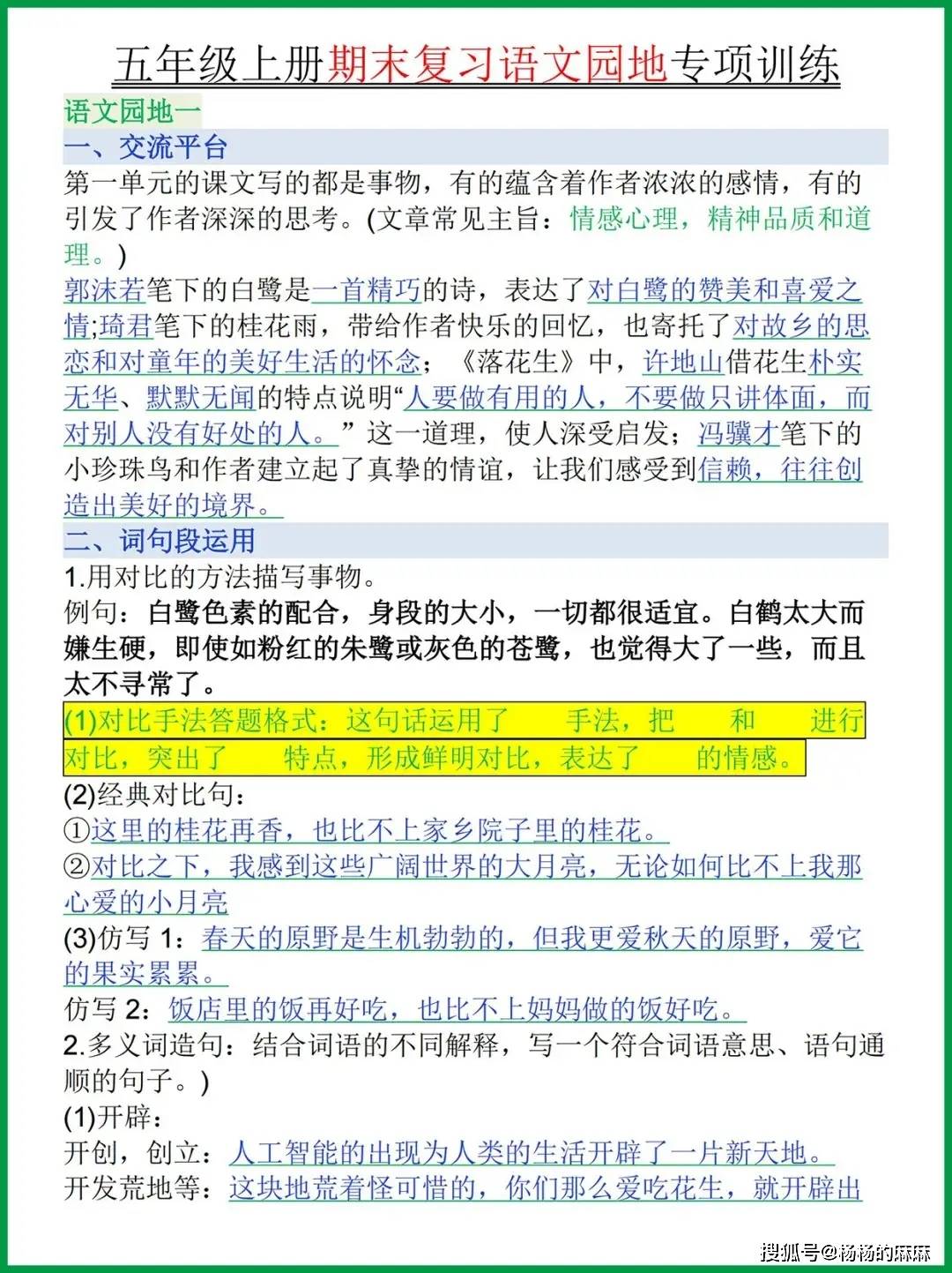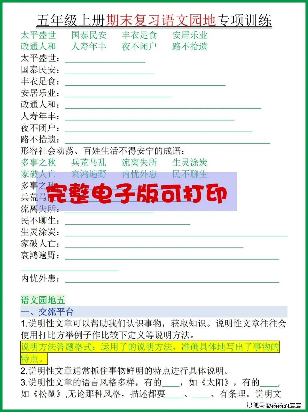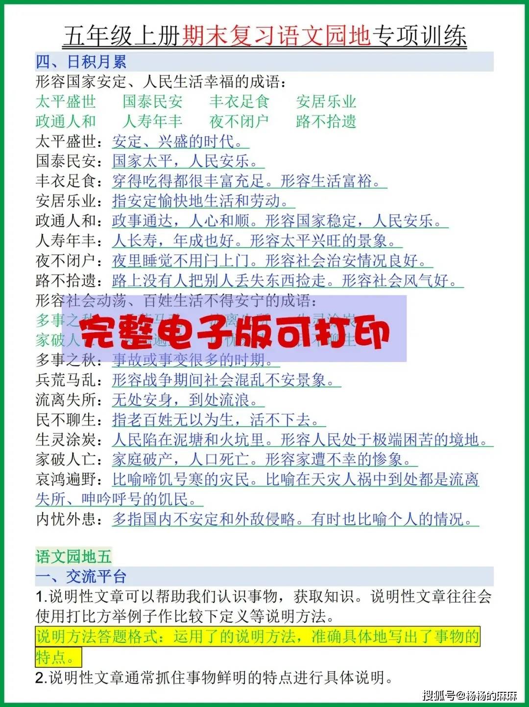 无论是日常用来巩固阅读方法、积累成语词汇,还是期末复习时系统梳理知识、强化写作技巧,这份资料都能精准适配需求。它以 “方法为纲、运用为目”,助力学生构建 “积累 — 方法 — 运用” 的完整语文知识体系,不仅能帮助学生在期末检测中发挥出色,更能为后续初中语文学习奠定扎实基础,成为五年级上册语文学习路上的 “得力伙伴”!