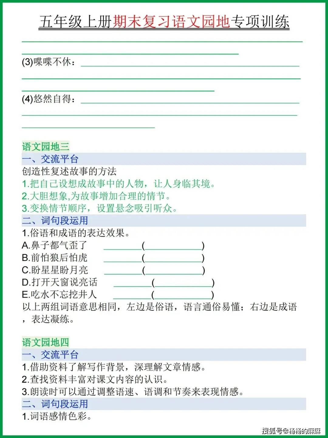 在语言运用与写作技巧提升上,资料以 “词句段运用” 为核心强化训练:“对比手法” 学习板块,通过 “不同事物对比”“同一事物前后变化对比” 的案例(如 “家乡过去与现在的环境对比”),引导学生理解对比的表达效果,并指导运用到写作中,让文章更具感染力;“多义词造句” 练习,精选 “温和”“新鲜” 等高频多义词,要求学生结合不同语境造句,锻炼语言运用的灵活性与准确性;“俗语与成语对比” 板块,将意思相近的俗语与成语配对(如 “打开天窗说亮话” 与 “直言不讳”、“吃水不忘挖井人” 与 “饮水思源”),通过对比分析两者的语言风格差异,让学生感受汉语的丰富性与多样性,学会根据表达需求选择合适的语言形式。