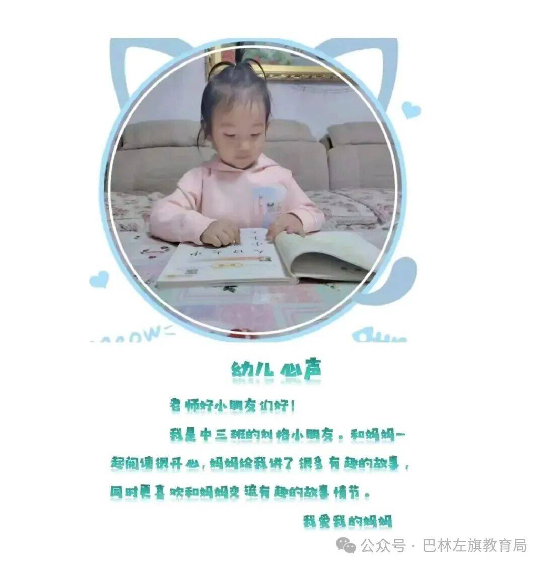 大一班张宇阳: 妈妈的怀里暖暖的呀,和妈妈一起读书好舒服~ 妈妈会用软软的声音讲小熊的故事,还会指着图画告诉我哪个是小花、哪个是小鸟,我不懂的地方,妈妈都会慢慢教我。