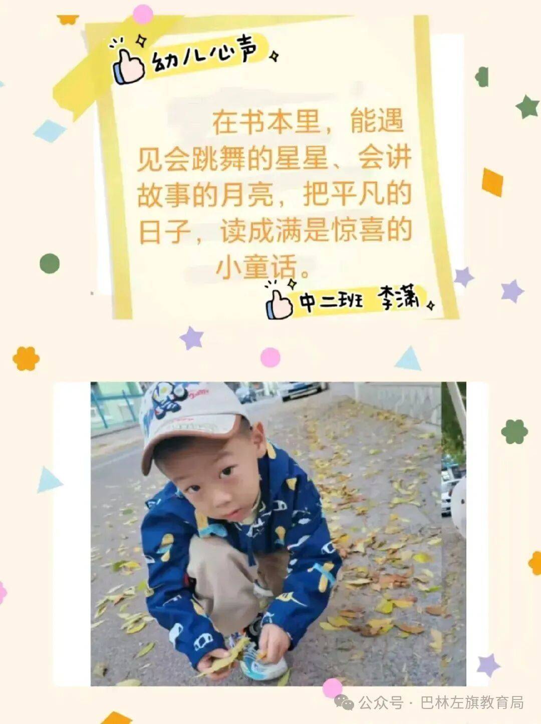 每晚台灯亮起,你小小的身影准时凑到书架前,踮着脚抽出那本翻得卷边的《晚安,月亮》——这是我们的约定,也是一天里最温柔的收尾。 ——小二班 孙潇