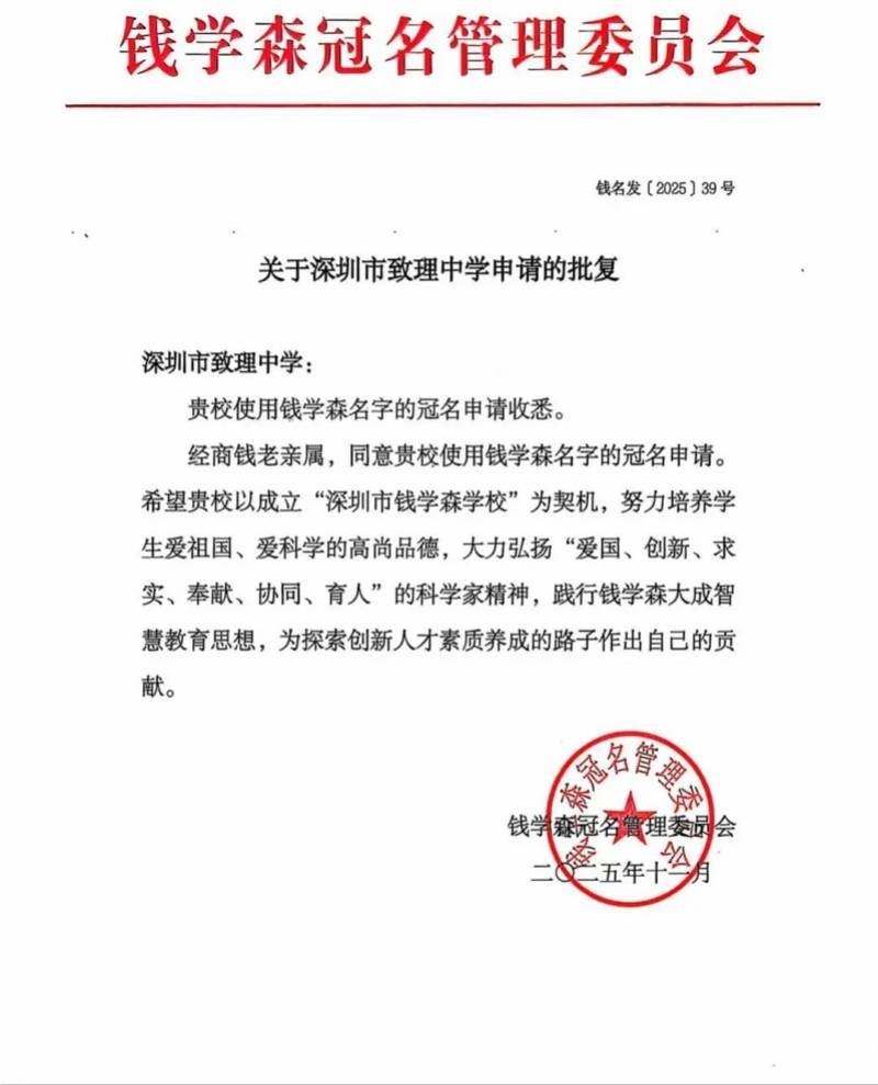 南都讯 记者任朝州11月12日,深圳市致理中学正式获得钱学森冠名管理委员会批复,启用“钱学森校”冠名。该校由此成为深圳市第一所获此殊荣的学校,标志着其在创新教育探索与拔尖人才培养方面迈入新的阶段。