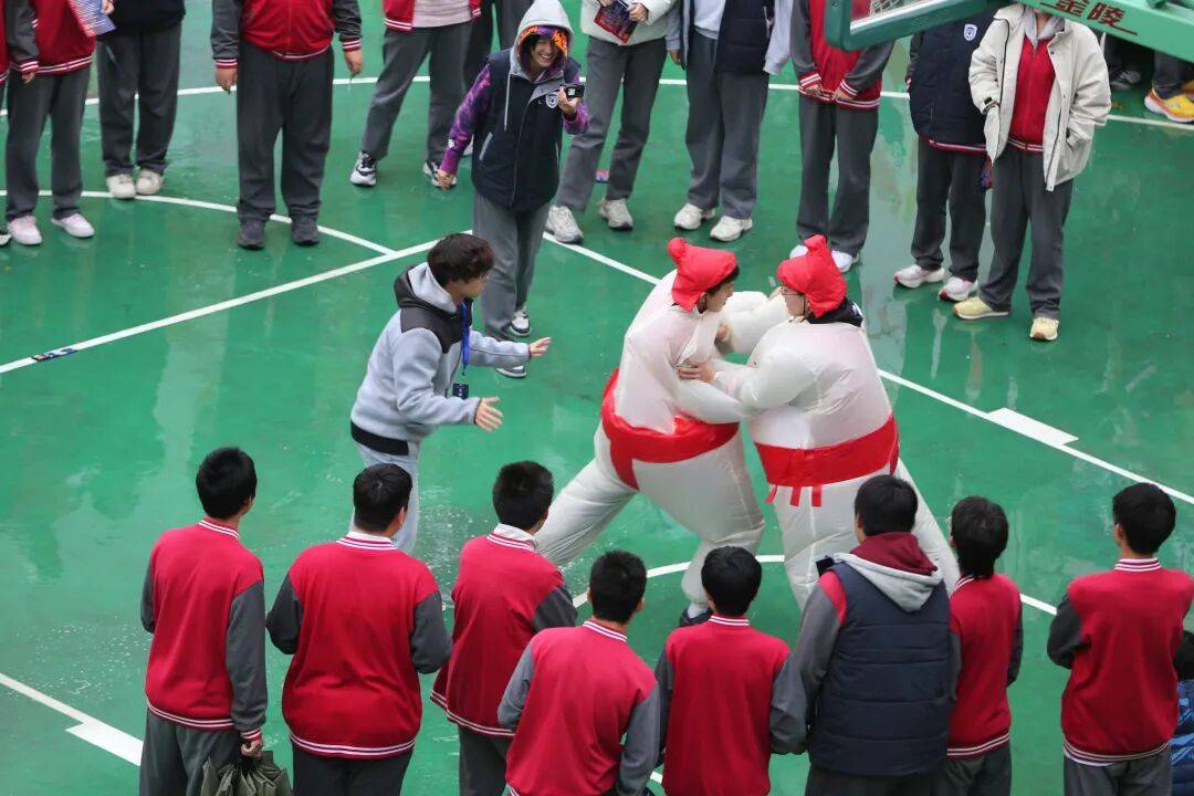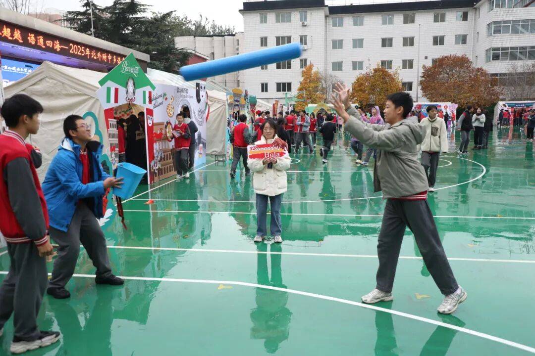 这是北外附中多语嘉年华操场上的一幕。活动当天,下着细微小雨,但是丝毫不影响同学们参与的热情。