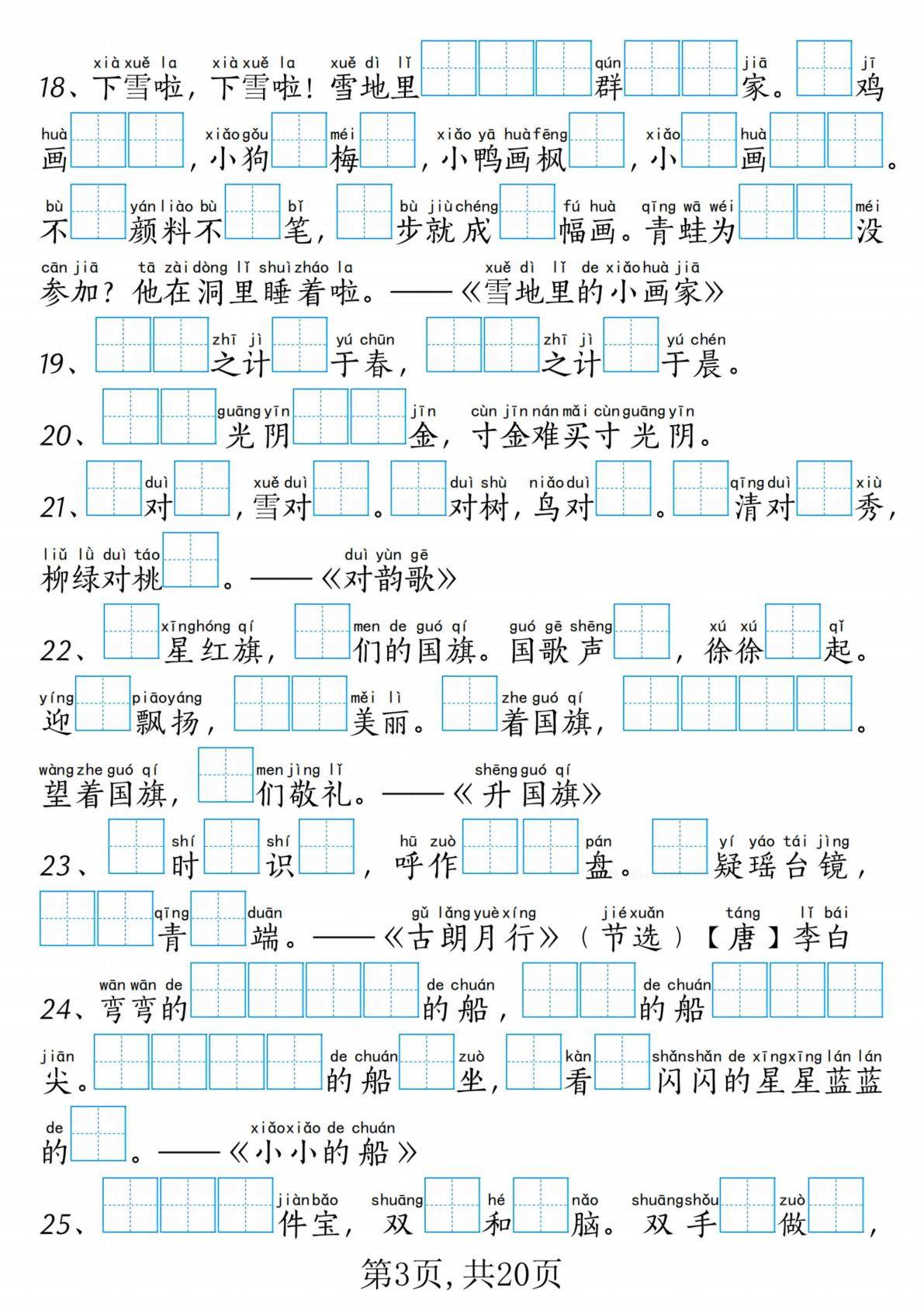 今天为大家分享:1119新一上语文课文内容填空专项练习+考试真题(20页),在内容涵盖上十分全面。首先是课文内容记忆板块,包含多篇课文的原文填空,如《我是中国人》《我爱五星红旗》《金木水火土》《咏鹅》《画》《雪地里的小画家》《小小的船》等课文的重点语句,涉及对爱国情怀、自然景象、动物特征、古诗等内容的记忆。其次是语言基础板块,包含看拼音写汉字、字词辨析等,如 “你我他”“一二三四五” 等基础字词的填写,以及对多音字、形近字的初步认知练习。另外,还有文化常识板块,包含对古诗、谚语的积累,如《悯农》《古朗月行》《对韵歌》中的诗句,以及 “一年之计在于春”“一寸光阴一寸金” 等谚语的填空。