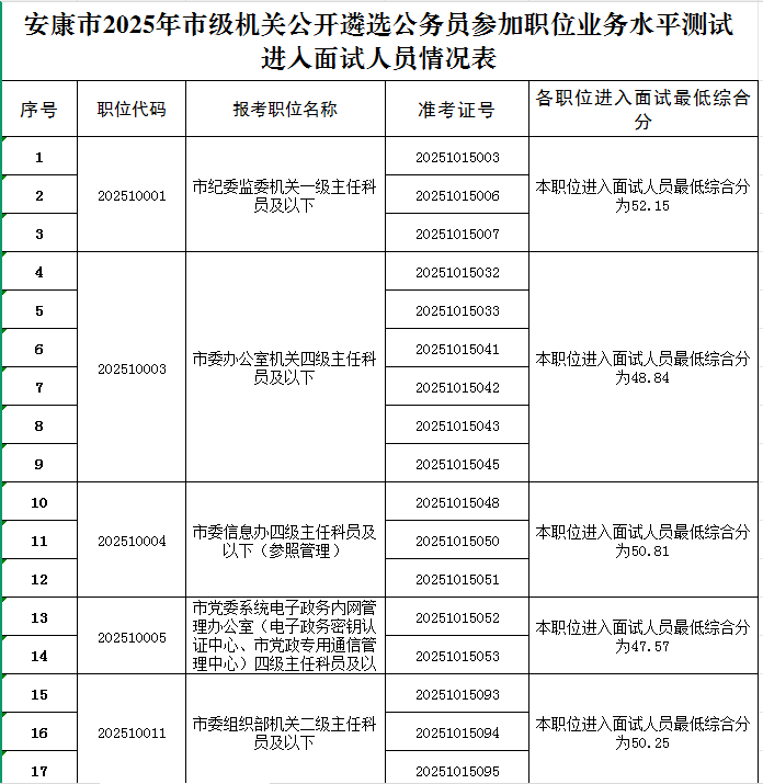 1.安康市2025年市级机关公开遴选公务员参加职位业务水平测试进入面试人员情况表