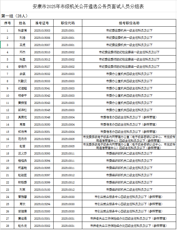 2.安康市2025年市级机关公开遴选公务员面试人员分组表