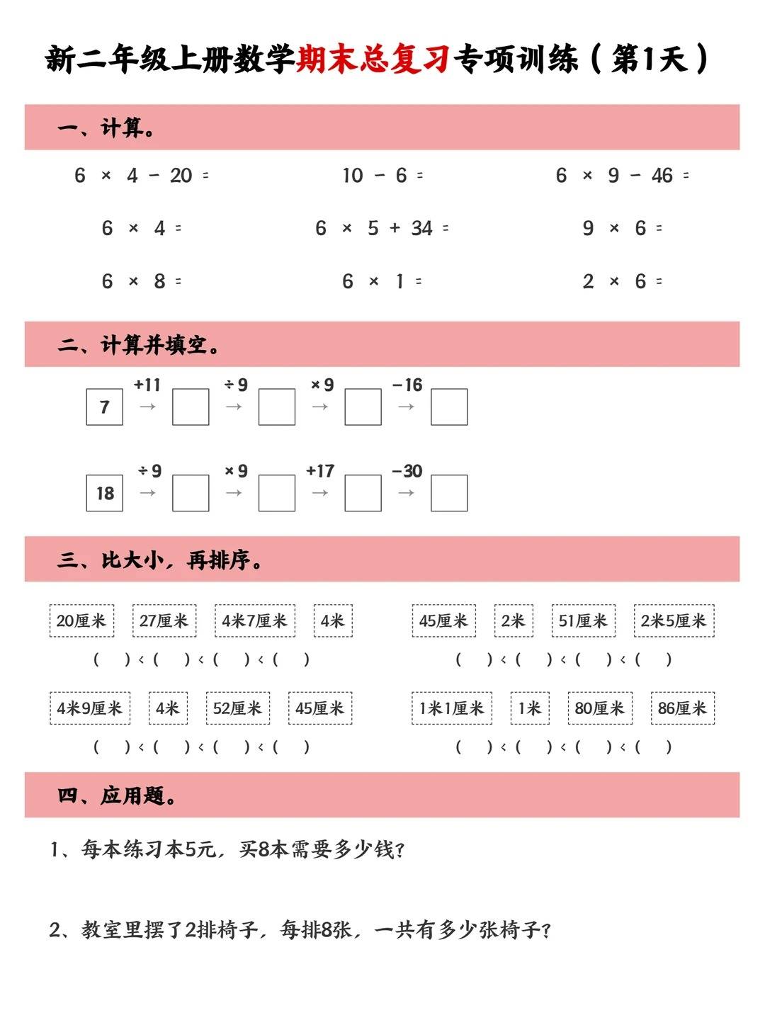 这份新二年级上册数学期末总复习专项训练,以每日训练的形式聚焦期末核心考点,涵盖计算、长度单位、应用题等模块,是二年级上册数学期末系统复习的日常巩固内容。