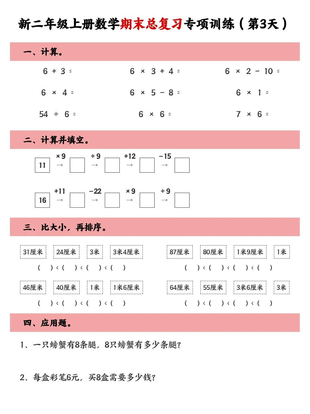 巩固的知识点扎实全面:掌握表内乘除法(如 6 的乘法口诀)、乘加乘减混合运算;熟悉厘米与米的单位换算,能正确比较不同长度的大小并排序;会用乘法解决 “总价 = 单价 × 数量”“总数 = 排数 × 每排数量” 类应用题。