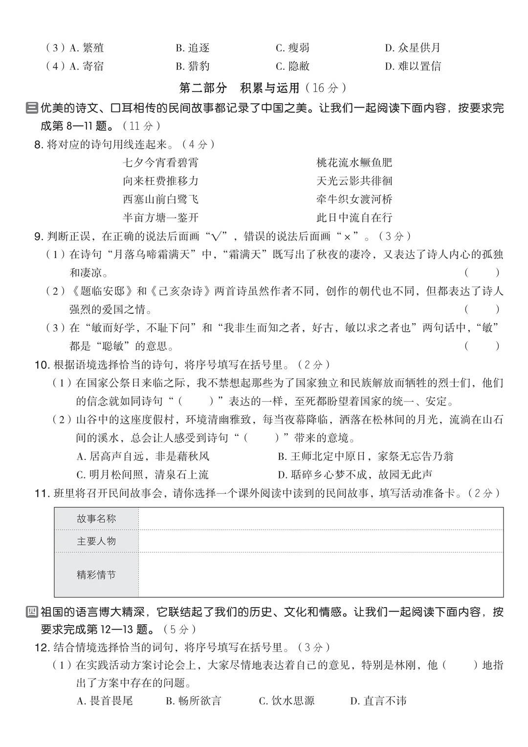 首先是适配五年级 “基础深化 + 素养提升” 的核心需求—— 五年级是语文从 “知识积累” 向 “文化感知” 过渡的关键期,这份试卷把 “易错音、形近字” 这类基础题和 “汉字文化(‘巳’的本义)、古诗文情感” 结合,既贴合五年级 “扎实字词根基” 的节奏,又通过 “中国桥材料阅读”“地图情短文” 渗透文化认知,为六年级的综合读写打基础。