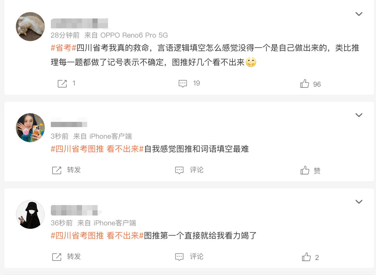 四川省考考生好像与山东部分考生同病相怜,称图推看不出来,有网友表示:四川省考我真的救命,言语逻辑填空怎么感觉没得一个是自己做出来的,类比推理每一题都做了记号表示不确定,图推好几个看不出来。还有网友表示:图推第一个直接就给我看力竭了。这样看来四川省考整体难度不小。