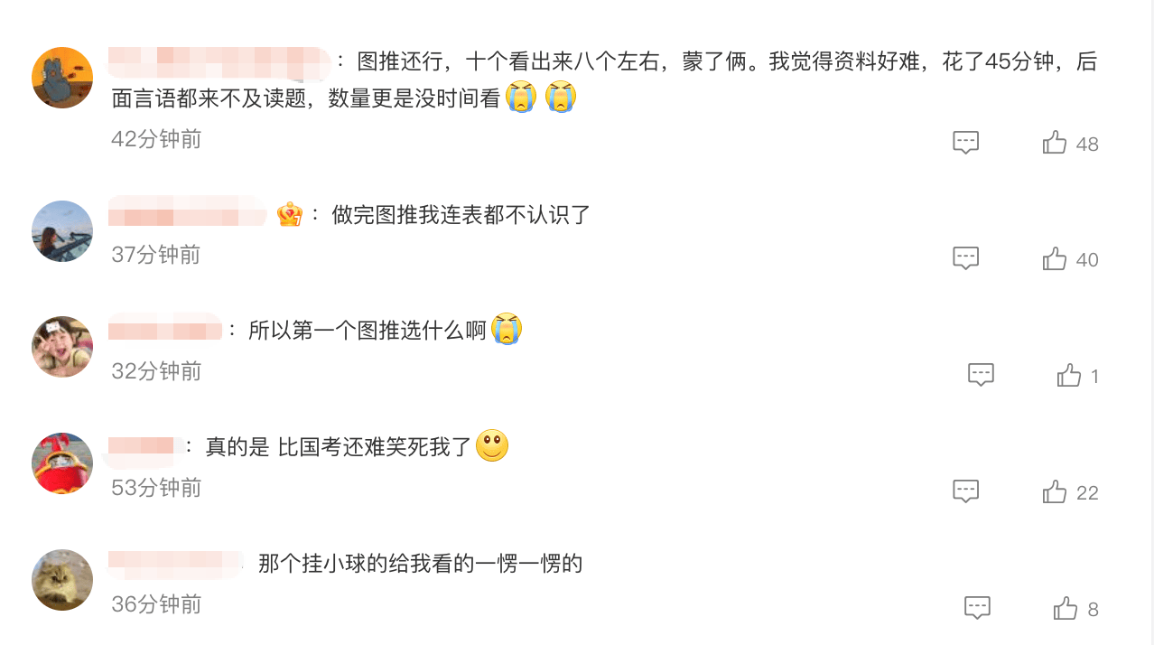 天津市考考生同样反馈图推难,有考生表示:图推难死了,言语排除两个蒙一个,逻辑专业名词很多。数量没看图填数的题。资料不难全是计算。最后我考场缺考九人。还有考生表示:我嘞个图推难啊,习惯先做判断上来图推给我干麻了。