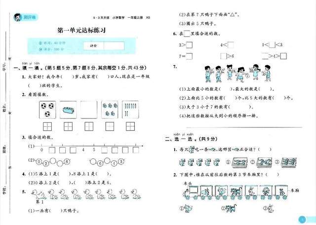 这份资料对学生学习的帮助是多维度的:它为刚入学的学生搭建了 “知识与生活” 的连接桥梁,比如 “介绍我的幼儿园” 活动中,通过数游乐设施、分类物品形状,让学生在熟悉的场景中感知数与图形,缓解了数学学习的畏难情绪;其次,同步课时练习紧贴课本进度,能帮助学生及时巩固课堂所学,比如 “0~9 的认识” 课时中,通过 “填数、分与合” 等题型,逐步建立数的概念;分层设计的题目适配低年级学生的认知节奏,基础题聚焦知识掌握,拓展题(如 “数的顺序填空、加减法应用”)则适度锻炼思维灵活性;单元达标测评卷能帮助学生阶段性检验学习效果,及时发现知识漏洞,比如 “第一单元达标练习” 中的 “生活中的数” 题目,既巩固了数的认读,也强化了知识的生活实用性;独立成册的参考答案便于学生自主核对,解析部分贴合低年级认知水平,有助于培养初步的自主学习习惯。整体而言,这份资料既是低年级数学知识启蒙的 “辅助工具”,也是培养数学学习兴趣的 “引导载体”,能有效帮助一年级学生平稳过渡到小学阶段的数学学习中。