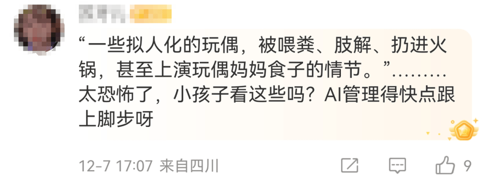 通过评论区,记者联系到网友邓女士(化姓)。她讲述了自己6岁的儿子趁其不备,用家人的手机观看一些令人毛骨悚然的视频:“一些拟人化的玩偶,被喂粪、扔进火锅,甚至上演玩偶妈妈食子的情节。”邓女士表示,她曾在数个视频下留言批评制作者,但留言几乎都被删除。