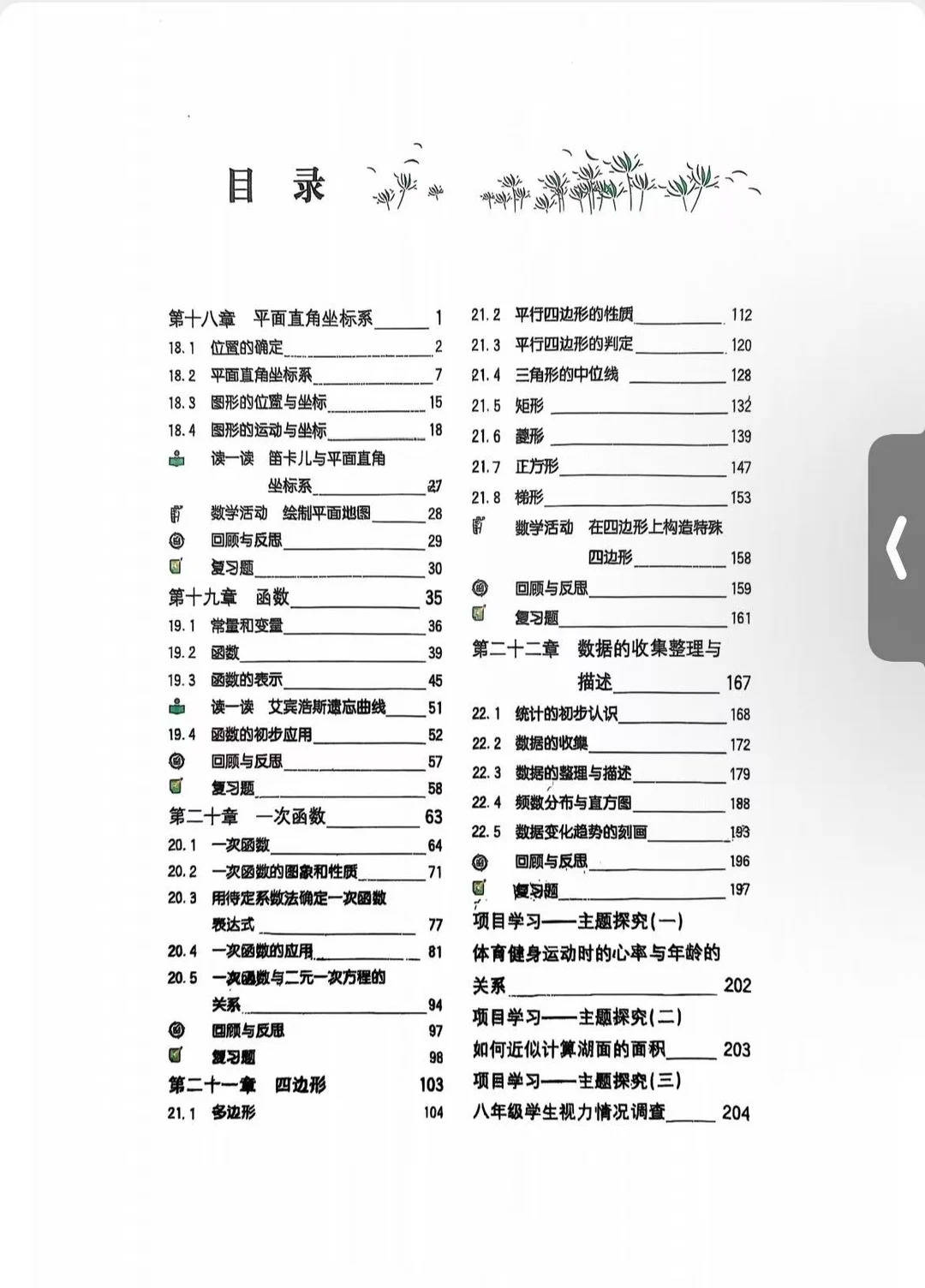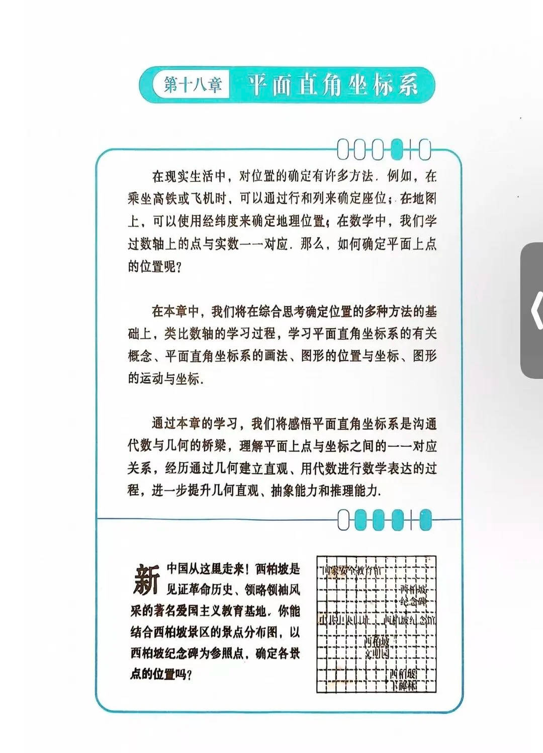 八年级下册数学教材也太懂几何与代数衔接了!这是 “知识体系 + 生活应用” 的实用课本,涵盖平面直角坐标系(位置确定、有序数对)、函数、一次函数、四边形、数据整理等全册核心模块,连 “有序数对定位、方位角 + 距离描述位置” 这类几何代数结合考点都配了生活场景(教室座位、象棋棋盘),从概念理解到综合应用一站式覆盖!
