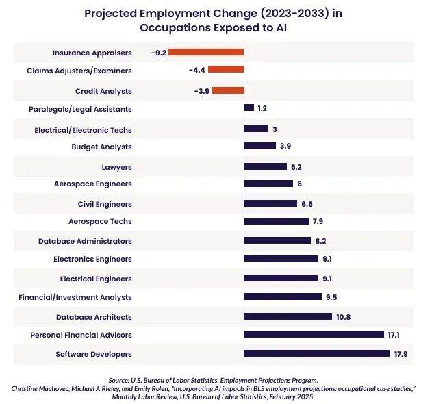 第三,AI加速职业的改变,也迫使高校重新定位。报告提到,未来保险、信贷、基础分析等行业将持续萎缩,而软件、数据、安全、医疗等方向会不断增长。