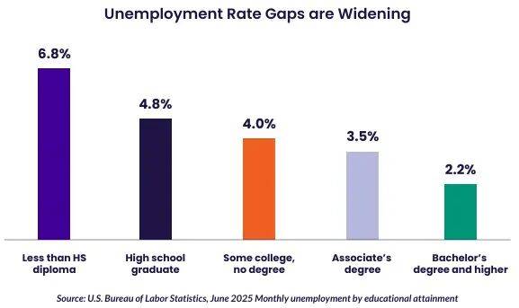 数据显示,教育水平越高,就业越稳、收入越高、经济风险越低,但美国公众始终认为大学无用,认为“大学很重要”的比例也从2010年的75%降至2025年的35%,报告将这一反差现象描述为“学历价值悖论”。