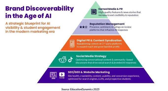 报告统计,73%的搜索来自AI生成的内容,而不是传统网页搜索。这说明了高校很难通过自己打造品牌去推广自己,能够直接影响或改变学生对学校印象的是互联网算法。