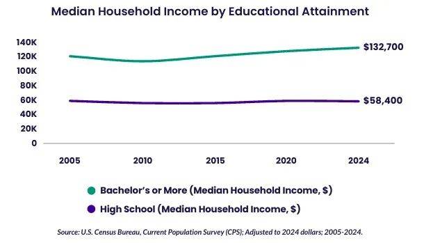 长远来看,高学历可以保证或者提高收入,本科及以上学历家庭的收入中位数达到13.27万美元,而只有高中学历的家庭只有5.84万美元。
