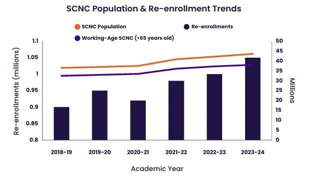 比如,希望获得技能提升的成年学习者、在高中阶段提前修读大学课程的“ Dual Enrollment学生,以及重返校园获取学位的职场人士。