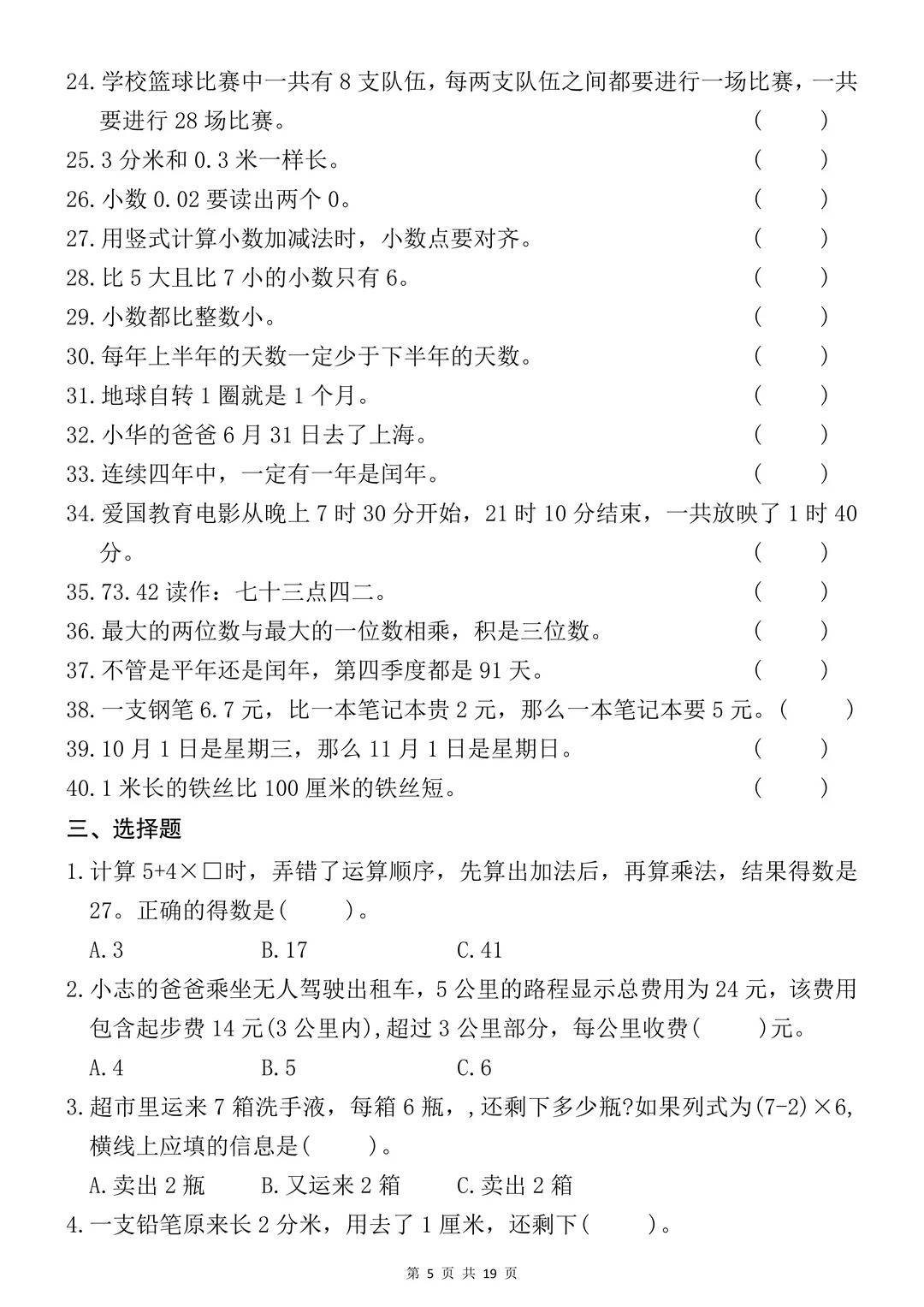 其次是设计踩中三年级 “避坑 + 高效” 的认知特点—— 三年级娃最怕 “隐性易错点”,这份资料把 “高频坑” 做成 “真题训练”:把 “锯 16 分米木棍成 2 分米段需锯 7 次”“错看运算顺序的还原法” 这些易错题直接练,把 “小数读写、平年闰年天数” 做成判断题辨析,刷题像 “解锁避坑技能”,完全不抵触;“题型分类 + 易错点标注” 的模式,还能帮孩子快速建立 “题型→易错点→解法” 的关联,效率直接拉满。