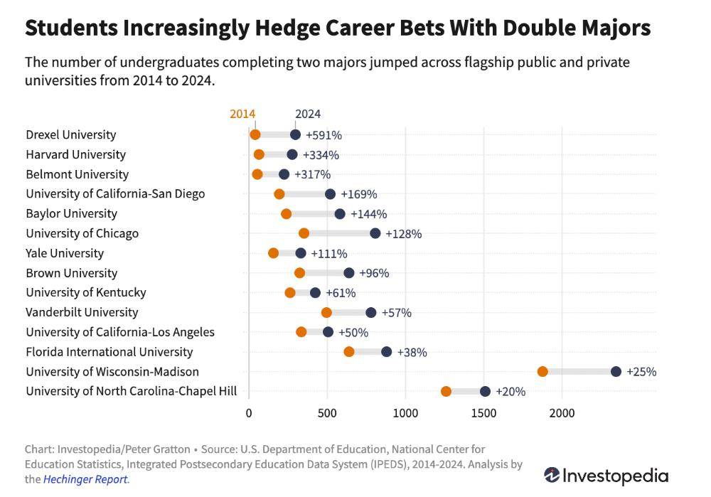 像过去十年间,威斯康星大学北卡罗来纳大学教堂山分校等大学拿到双专业的学生人数增长了超过25%芝加哥大学加州大学圣地亚哥分校增幅高达100%哈佛大学暴涨334%