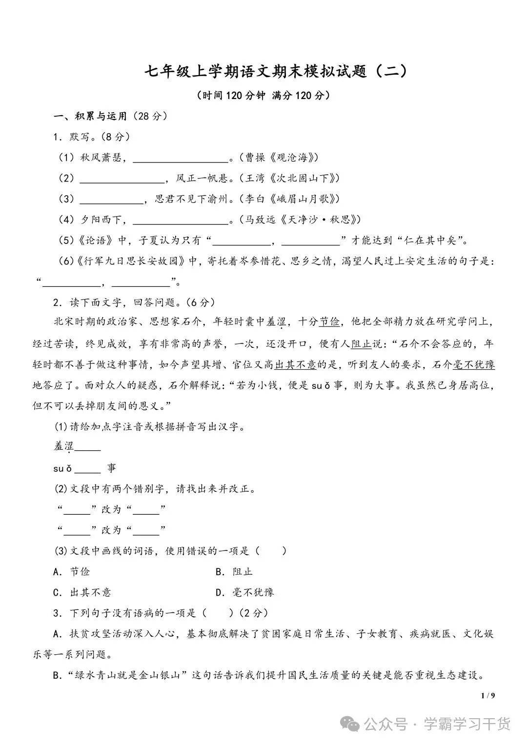 2025秋人教版七年级上册语文期末真题模拟测试卷(共3套 含答案)电子版可打印。
