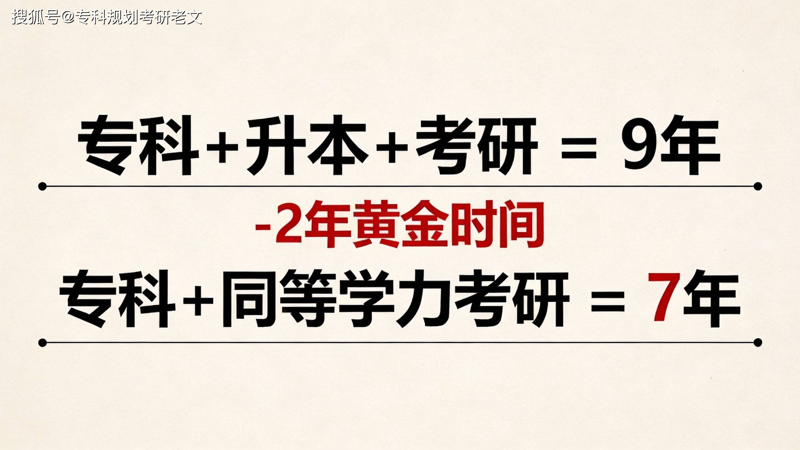 如果我们换一条赛道呢?专科3年毕业后,以满足“同等学力”要求的1年时间备考,直接考取研究生,再读研3年。总时长仅为7年,比传统路径整整节省两年。
