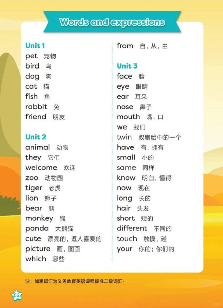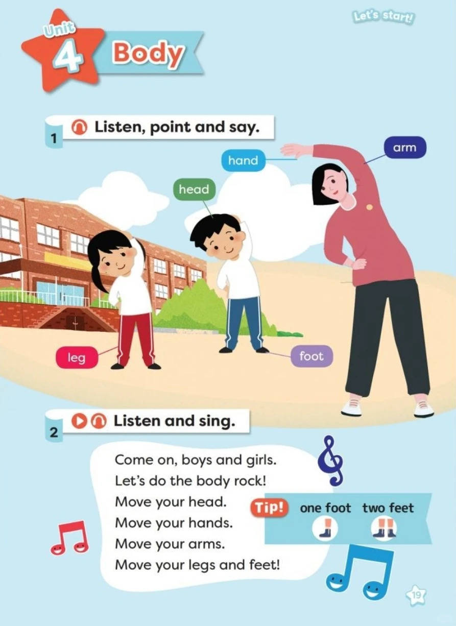 首先是适配一年级 “兴趣启蒙 + 具象认知” 的核心需求—— 一年级是英语 “开口说 + 认单词” 的关键期,常出现 “怕开口、记不住单词” 的问题。教材用 “宠物叫声儿歌(bird 的 tweet 声)”“身体律动歌曲(Move your head)” 把单词和趣味场景绑定,用 “指认面部 / 身体部位” 的具象任务帮孩子建立 “单词 - 实物” 的关联,既贴合 “一年级重兴趣驱动” 的特点,又填补了 “单词只会认不会说” 的漏洞。