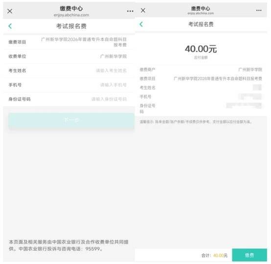 报名考生需交报考费40元/科。省统考科目报考费在报名系统缴交,我校自行组织命题科目报考费由我校收取。已成功报名(交费成功)的考生,根据广东省教育考试院有关规定,若个人原因放弃报名,不予退回报考费。我校自行组织命题科目报考费缴费方式如下:
