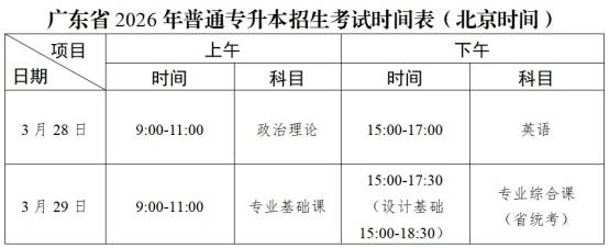 (四)普通专升本招生考试时间为2026年3月28日(星期六)至29日(星期日)两天,具体安排见下表:
