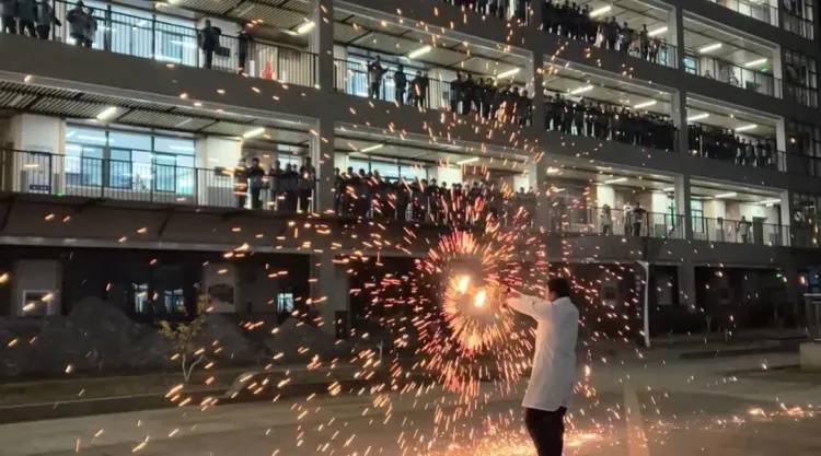 视频里,在夜色中的校园教学楼间,一位老师手持竿子,用力一挥。刹那间,火星如瀑布般炸开。