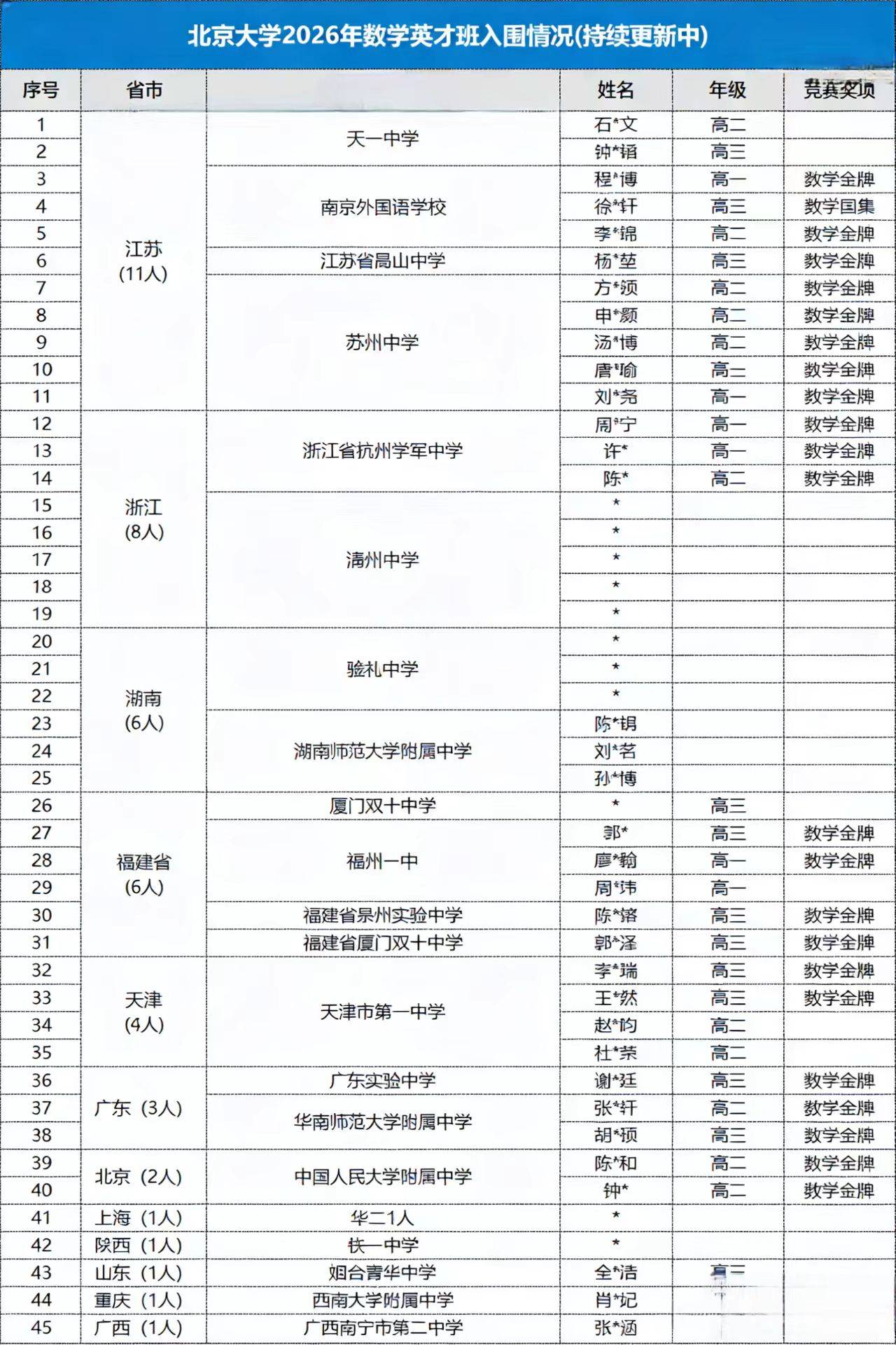 北大数学英才班(45人):江苏省以11人领先全国。温州中学与苏州中学各5人,表现突出。