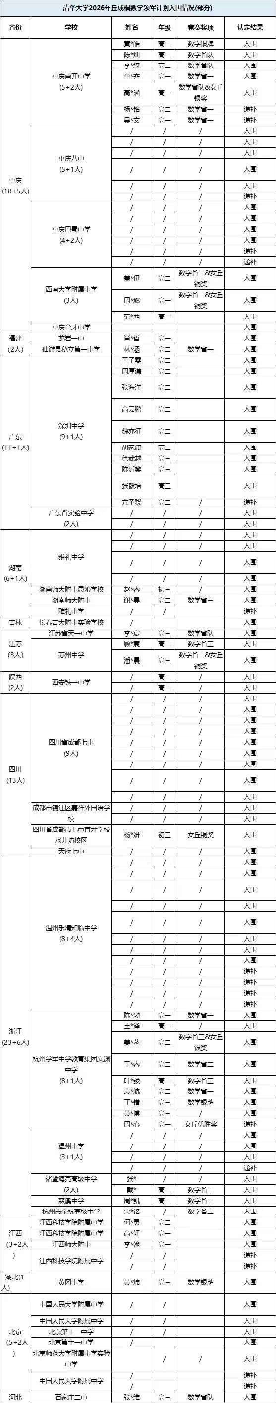 清华丘成桐数学领军计划(95人):入围学生多为高二高三,有少量高一也成功入围,多数学生获得数学省一省二奖项及女丘奖项,少部分获得数学省三奖项也能入围。浙江省以23人位列第一,重庆市19人居次。高中学校中,成都七中与深圳中学各9人,并列榜首。