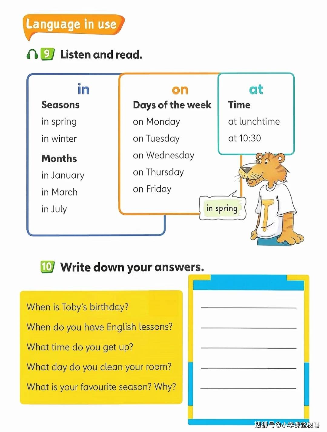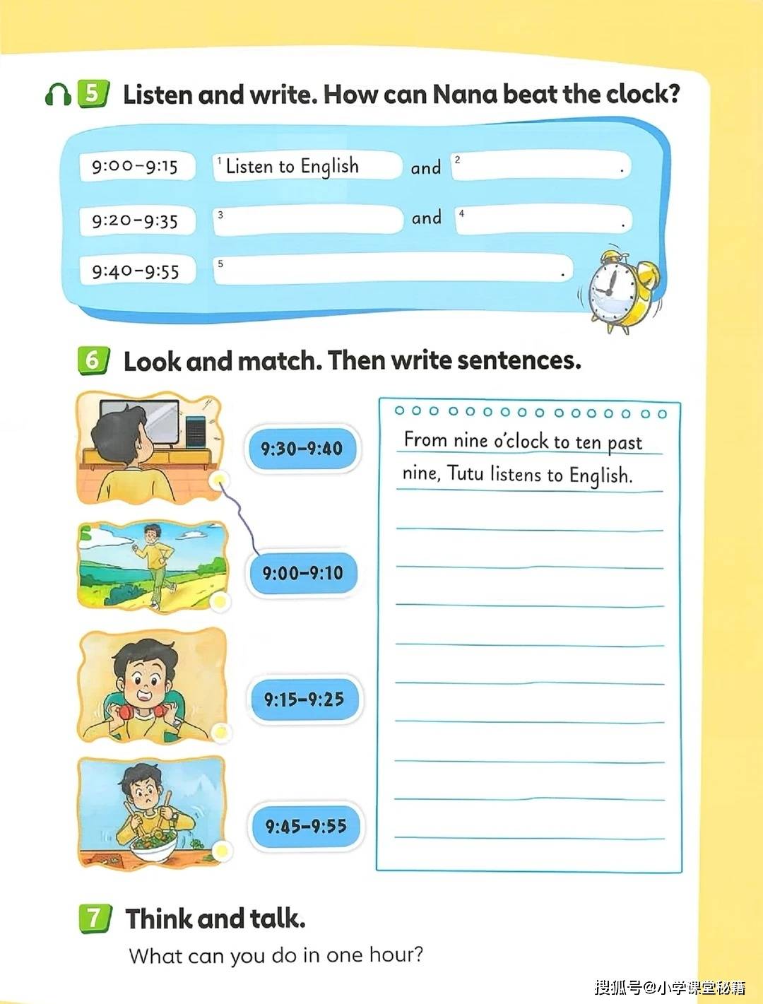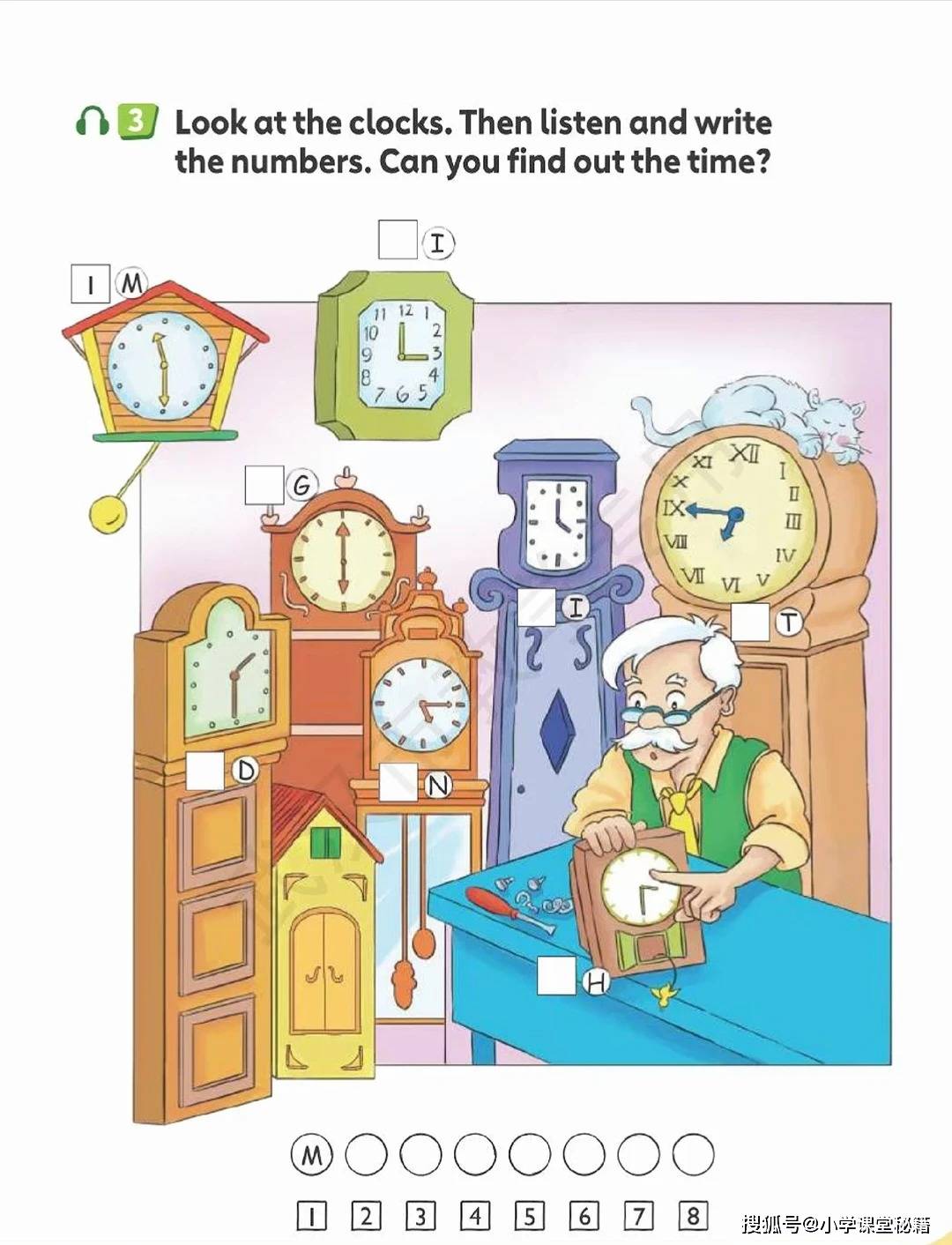 开篇单元 “Around the clock” 从一首《Listen to the clock》歌谣切入,“Tick tock, tick tock. What's the time?” 的吟唱搭配色彩明快的时钟插图,把抽象的时间表达变成了可感知的游戏。随后的钟表匠铺场景中,复古风格的座钟、挂钟错落摆放,孩子需要观察指针位置写出对应时间,在观察力训练中巩固 “fifteen”“half past” 等核心表达。这种 “视觉 + 听觉 + 动手” 的多感官输入,让知识点不再停留在纸面,而是转化为可输出的语言能力。