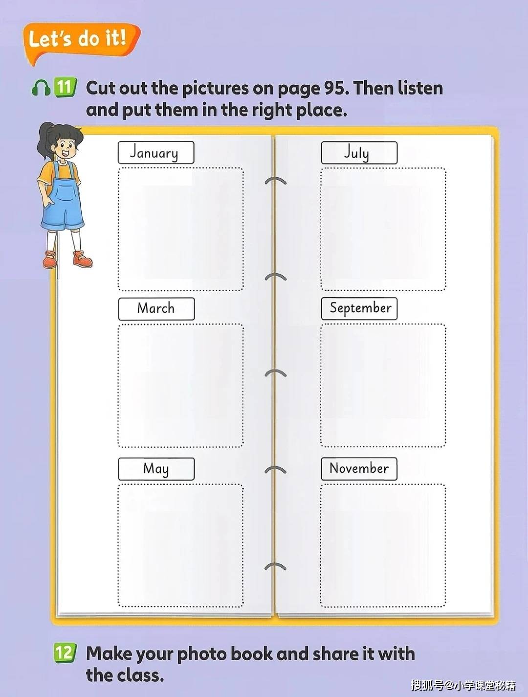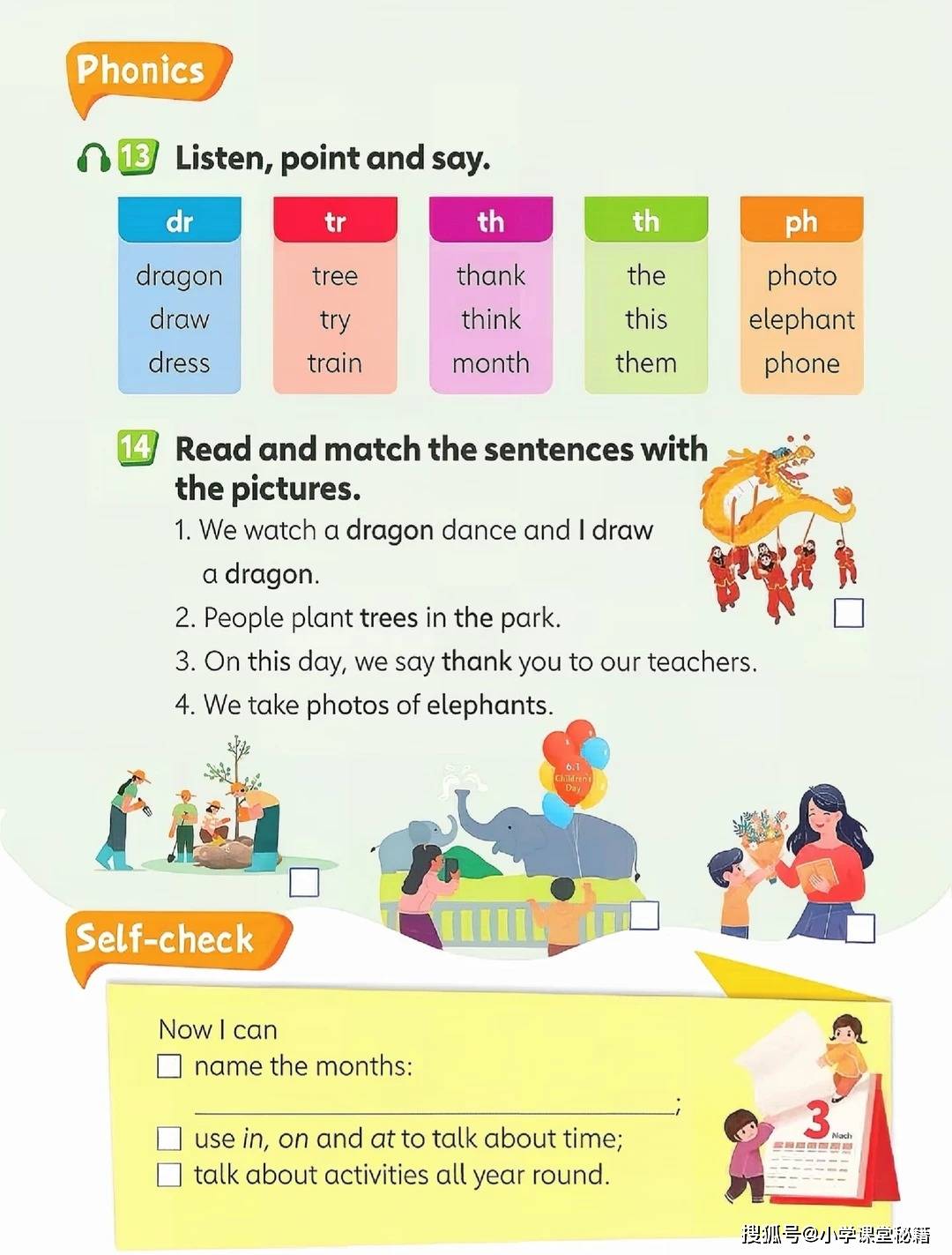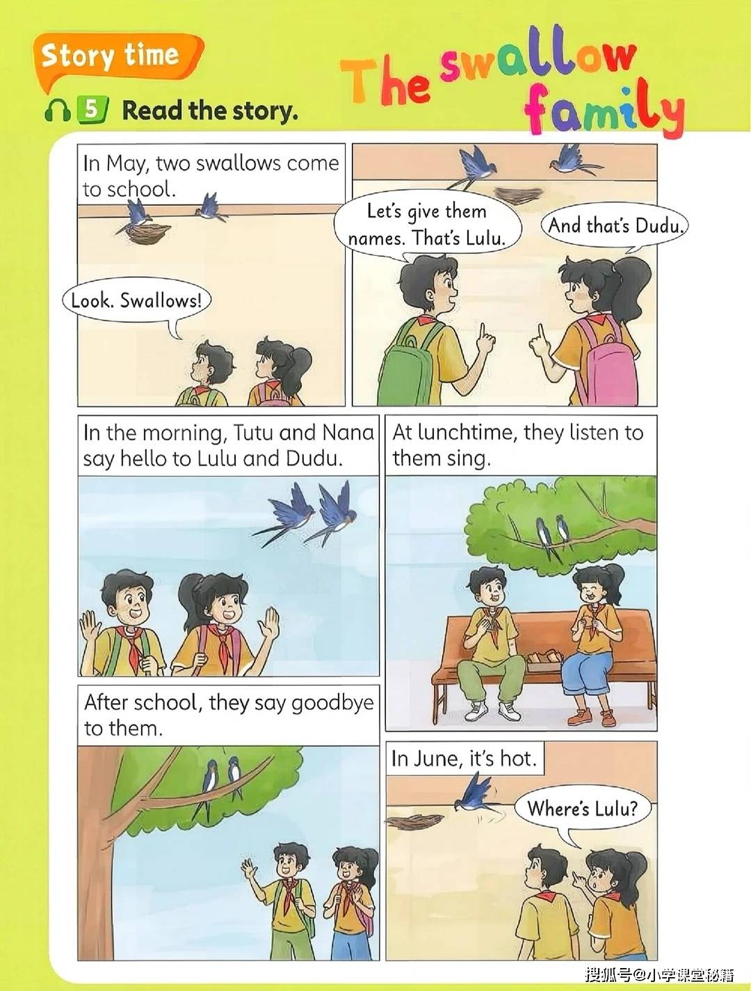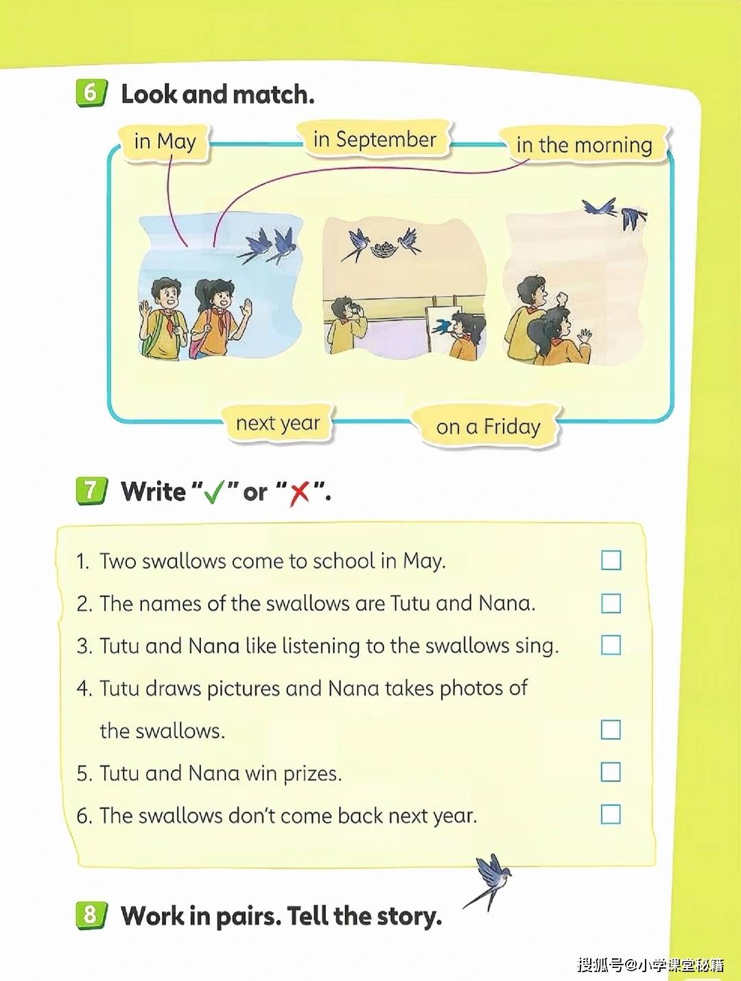 开篇单元 “Around the clock” 从一首《Listen to the clock》歌谣切入,“Tick tock, tick tock. What's the time?” 的吟唱搭配色彩明快的时钟插图,把抽象的时间表达变成了可感知的游戏。随后的钟表匠铺场景中,复古风格的座钟、挂钟错落摆放,孩子需要观察指针位置写出对应时间,在观察力训练中巩固 “fifteen”“half past” 等核心表达。这种 “视觉 + 听觉 + 动手” 的多感官输入,让知识点不再停留在纸面,而是转化为可输出的语言能力。