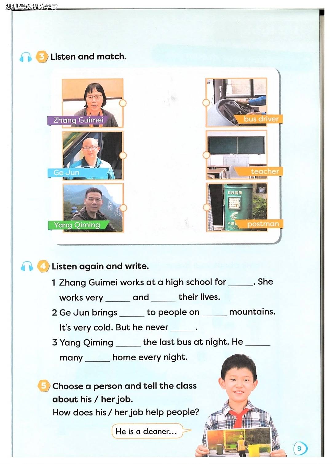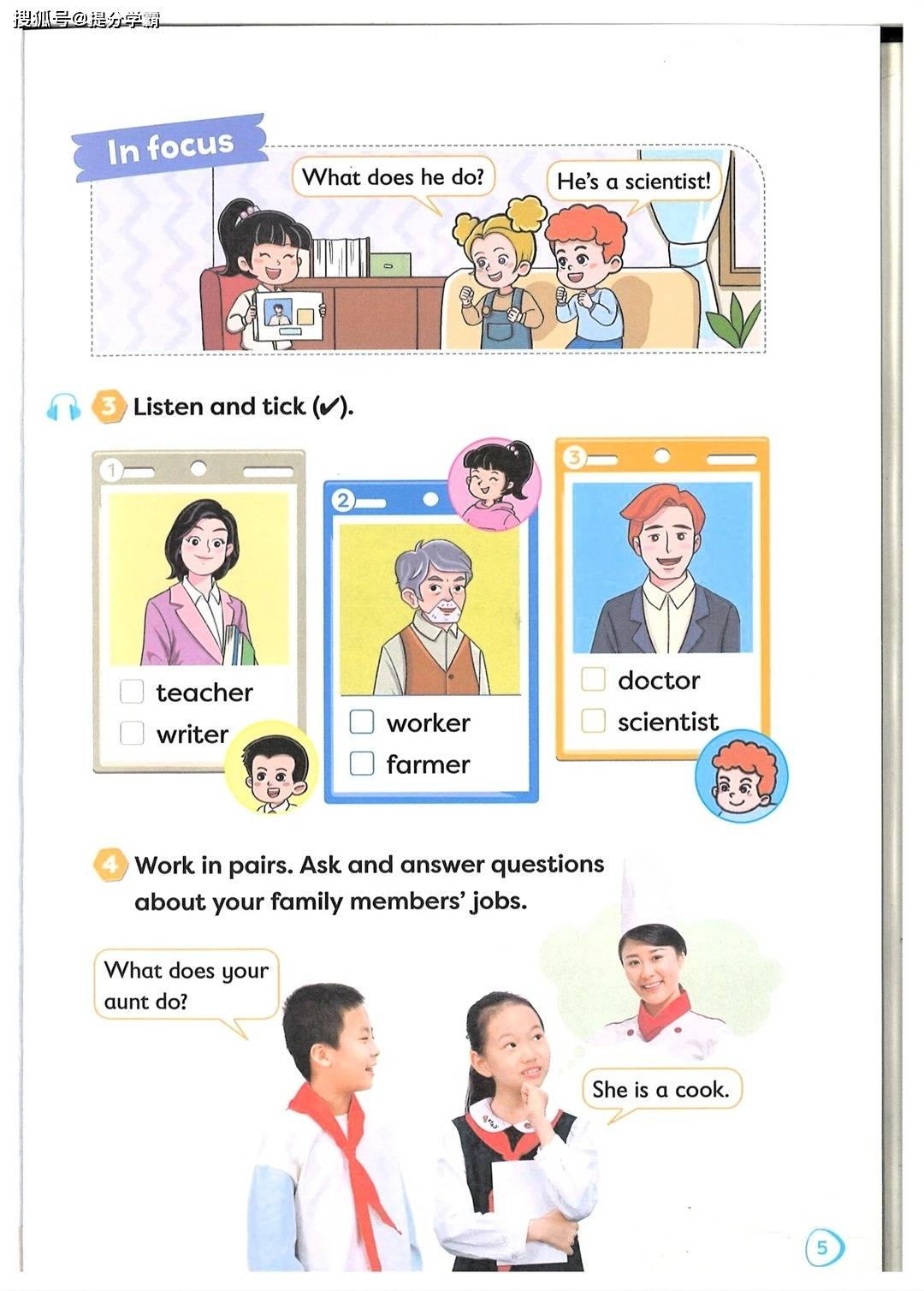 教材开篇以 “People at work” 为主题,用一张城市功能区地图和朗朗上口的职业歌谣,将 “doctor”“farmer”“police officer” 等职业词汇与真实场景绑定。孩子在连线游戏中,自然理解不同职业对应的工作场所;通过 “Lingling 的爸爸是做什么的” 趣味猜谜故事,学会用 “What does he do?”“He's a scientist” 等核心句型进行交流。更具巧思的是 “Night owls” 阅读板块,以猫头鹰的视角介绍夜班工作者,既拓展了职业词汇,又引导孩子理解不同职业的社会价值,在语言学习中融入人文关怀。