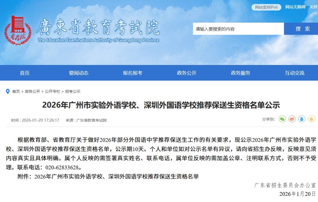 1月20日,广东省教育考试院发布了2026年广州市实验外语学校、深圳外国语学校推荐保送生资格公示名单。名单显示,广州市实验外语学校有62人获得保送生资格,深圳外国语学校有121人获得保送生资格,一共有183人获得保送生资格。两校保送生人数与往年持平。